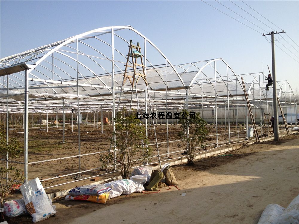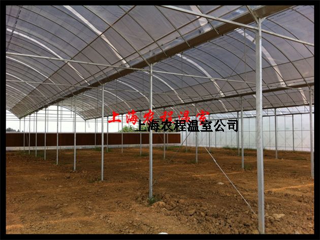 該溫室是在普通連棟溫室的基礎(chǔ)上加大空間、材料加大、增加設(shè)備、溫室拱桿和縱桿采用40x60熱鍍鋅矩形管,副拱桿用φ32X1.5熱鍍鋅圓管;立柱口采用φ60x80x2.5mm熱鍍鋅矩形管。增強(qiáng)了抗風(fēng)雪載能力,適用于機(jī)械化生產(chǎn)和育苗。